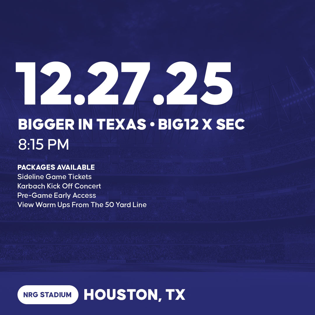 The 2025 Kinder's Texas Bowl takes place on Saturday December 27, 2025 and will feature teams from the Big 12 and SEC Conferences. The game marks the 20th annual Texas Bowl and is part of the bowl games that conclude the 2025 FBS football season. Participating schools will be announced in early December. Make it a night to remember at the NRG Stadium by adding on this exclusive game day package, which includes the following: